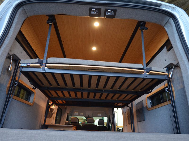 Another Roost innovation in Sprinter and Transit van bed design is the Strap-Up Hanging Bed System. This system can be used as a primary bed offering maximum garage and storage solutions, or as a “bunk” bed over our Fu-Kit Bed System offering an excellent solution for families traveling with children.